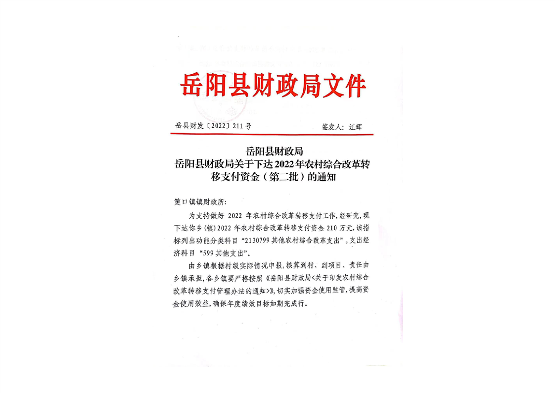 岳陽縣財政局關(guān)于下達(dá)2022年農(nóng)村綜合改革轉(zhuǎn)移支付資金(第二批)的通知(岳縣財發(fā)〔2022〕211號)及資金撥付單