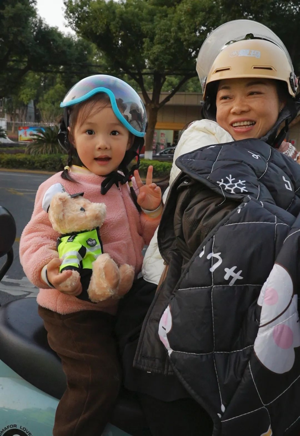 因?yàn)槟惚憩F(xiàn)很好,你和媽媽都戴了頭盔。小熊送給你!