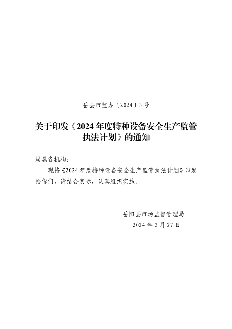 岳縣市監(jiān)辦〔2024〕3號關(guān)于印發(fā)《2024年度特種設備安全生產(chǎn)監(jiān)管執(zhí)法計劃》的通知