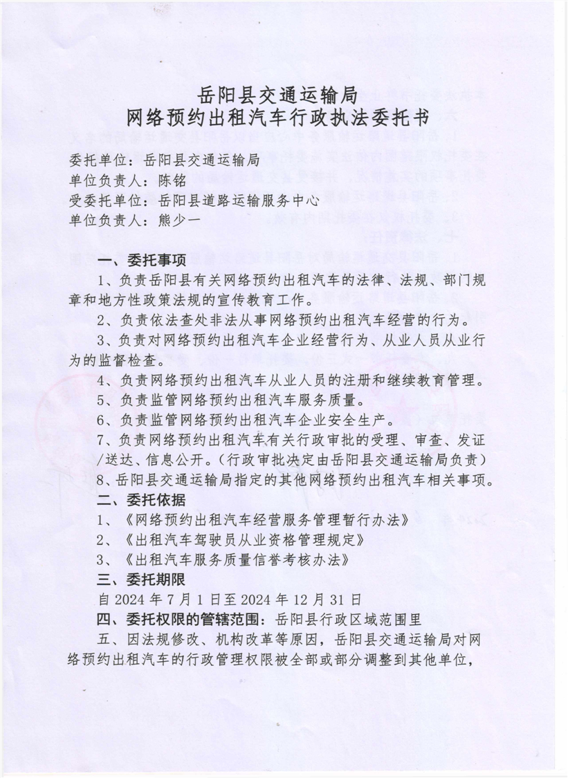 岳陽縣交通運輸局網(wǎng)絡(luò)預(yù)約出租車行政執(zhí)法委托書(20240701-20241231)